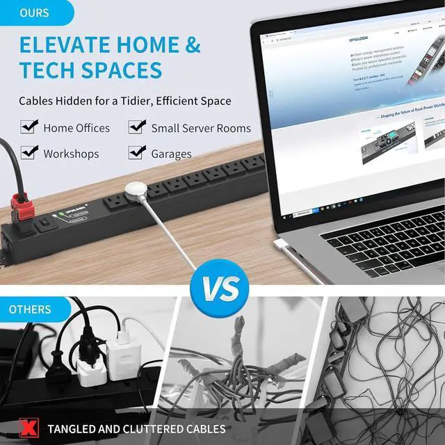 [Professional Rack & Office Power] The Apislogik aluminum alloy long PDU features a 6ft 16 AWG power cable (NEMA 5-15P to Auto-Lock C13) to ensure stable and secure connections, preventing accidental disconnections. Ideal for server racks, offices, and other professional workspaces that require continuous, reliable power.