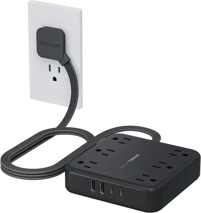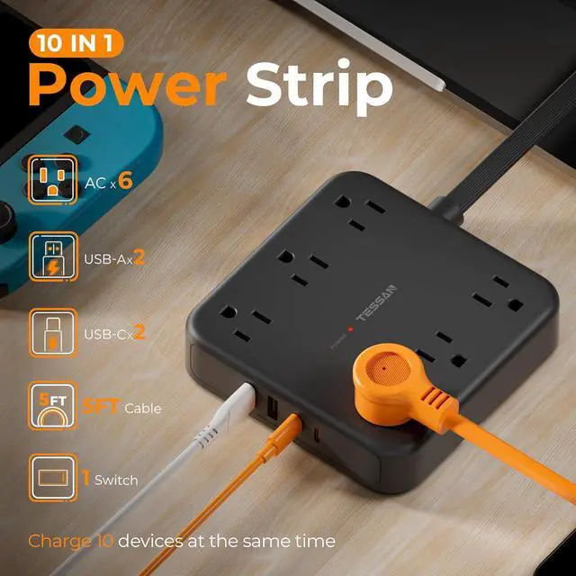 Black Power Strip: 5 Ft extension cord with multiple outlets features 6 AC outlets (1250W Max), USB C2 PD 20W Max, USB C1 15W Max and 2 USB A (12W Max per port); This black extension cord supports simultaneous charging for up to 10 devices without crowding, helping you keep your desk, nightstand, or workspace neat and organized