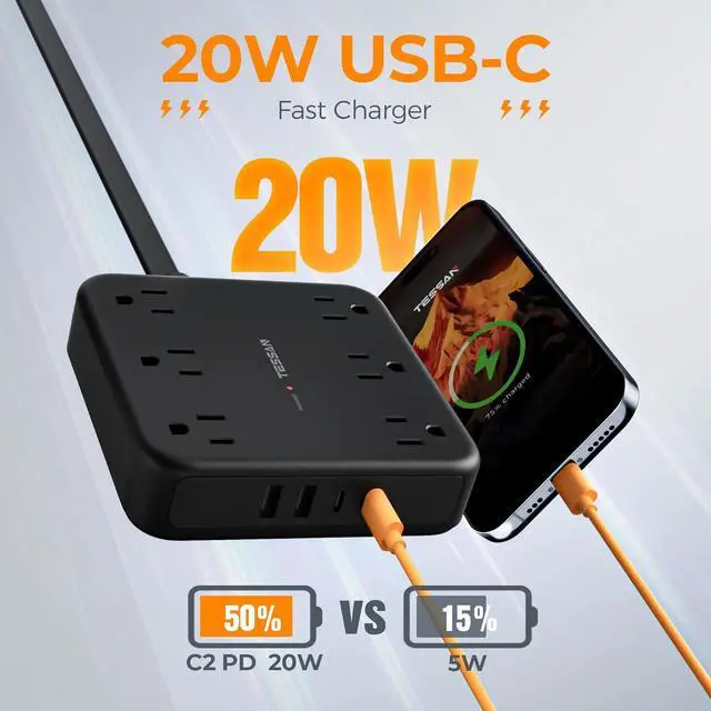 2 USB C and 2 USB A: This flat plug power strip is equipped with USB C2 PD 20W Max, USB C1 (5V 3A, 15W Max) and 2 USB A (5V 2.4A, 12W Max per port), meeting charging needs of various USB devices; Power strip with USB ports can fast charge mobiles, reducing waiting time