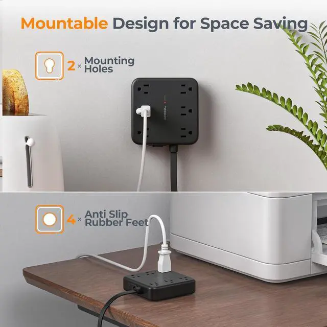 Mountable Power Strip: This flat power strip is equipped with 2 mounting holes, allowing secure installation in various applications; 4 rubber feet on the bottom effectively prevents this power strip from slipping and sliding