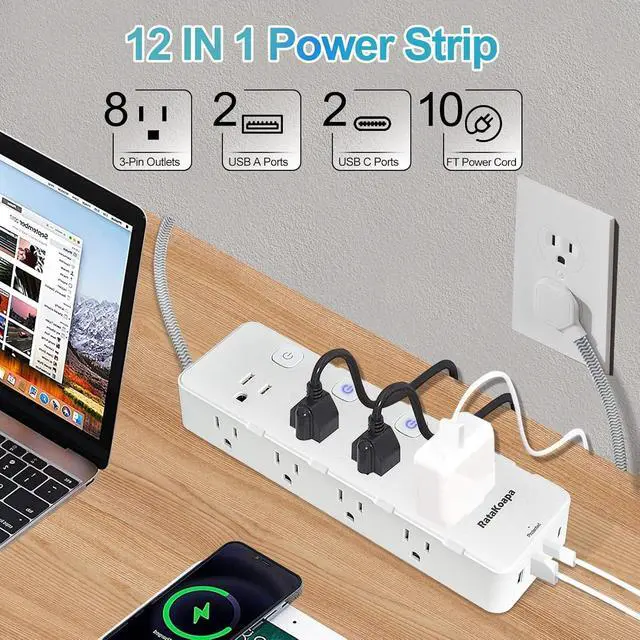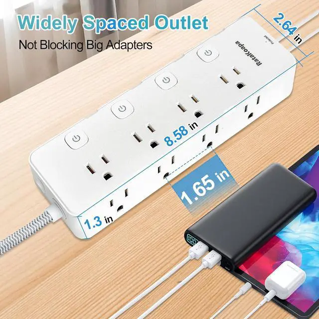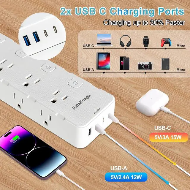 Power Strip: The usb power strip could turn 1 sockets into 8 AC outlets(1875W/15A Max), 2 USB-A ports(5V/ 2.4A MAX) and 2 USB-C ports(5V/3A MAX), all USB ports output is 5V/ 3.4A, which means you can plug in multiple devices at once without worrying about insufficient outlets. In addition, the outlets are well-spaced( 1.6 in), so they do not block the adjacent outlets even if you have several large adapters plugged in