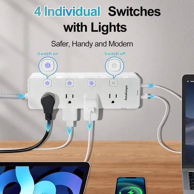 4 Individual Switch: The long power strip features four individual switches, allowing users to turn each outlet on or off as needed, with indicator lights that illuminate or extinguish correspondingly based on whether the switch is activated or deactivated