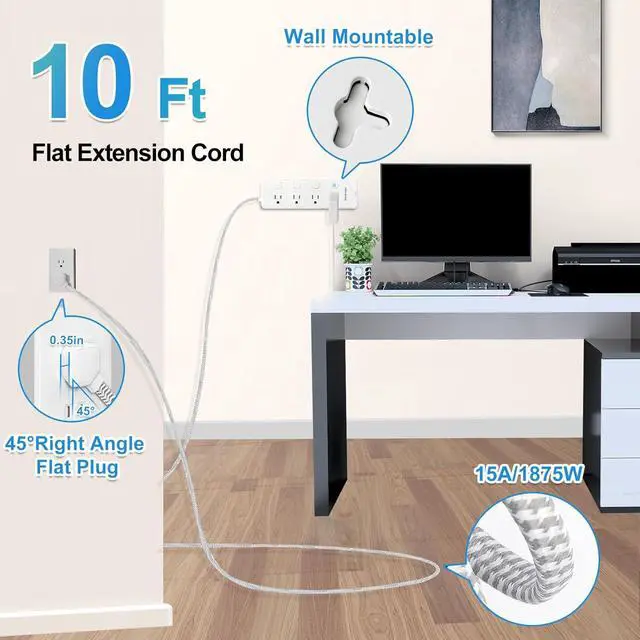 Wall Mountable Power Strip: The two mounting holes on back allows this white power strip to be securely installed in various applications, This wall surge protector with usb can also be used as a desktop power strip or nightstand USB charging station without slipping off, which can save more space, suitable for the home, office, and college dorm room essentials