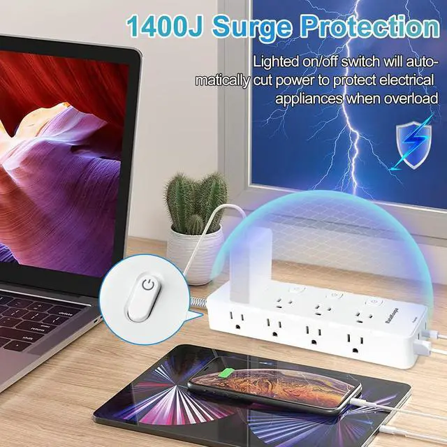 1400J Surge Protection with Overload Switch: The electric strip has a 1400J energy rating providing a reliable power extension cord to protect your devices from the damage of lightning strikes and sudden surges. At the same time, the overload protector switch will shut off automatically when the electrical circuit is abnormal to keep your devices safe