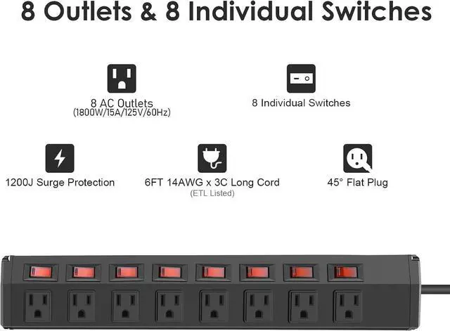 Convenient Individual Switches: With 8 individual switches, no more hassle of plugging and unplugging devices. Turn on or off the equipment independently. Save energy and money.