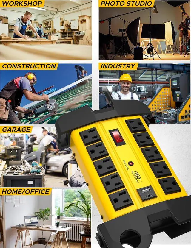 [6Ft Cord & Metal Housing] Crafted with a 14 AWG ETL Certified cord, this power strip offers both durability and extended reach. This metal heavy duty power strip ensures enhanced safety and longevity, making it ideal for garages, workshops, and more.