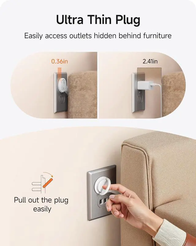 6 Ft Extension Cord & Ultra Thin Flat Wall Plug: 6ft power cord allows you to keep the flat power strip in an unobtrusive location while making sure it reaches your devices. With only 0.36 inch flat polarized plug, this 2 prong power strip surge protector can infinitely close to the wall, hide in the back of furniture, maximum save your space. The folding ring helps you unplug the plug easily in the narrow space. The 45° right angle low profile flat plug design keeps anther outlet free