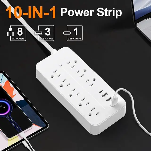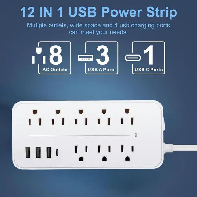12-in-1 USB-C Power Strip: Ultimate Charging Hub Meet your ultimate charging solutionthe 12-in-1 USB-C Power Strip designed for modern multitasking. With 8 spacious AC outlets (3 wide-set to fit bulky adapters), 3 USB-A ports (5V/ 2.4A each), and 1 high-speed USB-C port, this hub effortlessly powers 12 devices simultaneously. Perfect for home offices, dorm rooms, or travel, it delivers max 1250W (125V, 10A) output and supports universal voltage (100V-250V) for global compatibility. No more outlet shortagesjust seamless, organized power for all your gadgets.