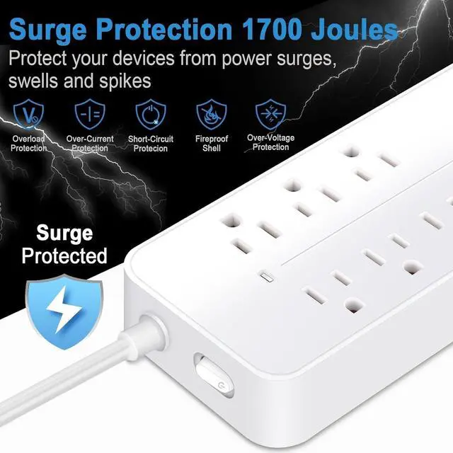 Advanced Surge & Overload Protection: Defend Your Devices Safeguard your computers, TVs, gaming consoles, and appliances with 1700-joule surge suppressionblocking lightning strikes, voltage spikes, and power surges. The built-in 10A circuit breaker instantly cuts power during overloads, preventing damage to connected devices. Plus, its grounded 3-prong design ensures stable, interference-free electricity. Trust the shield that keeps your investments safe.