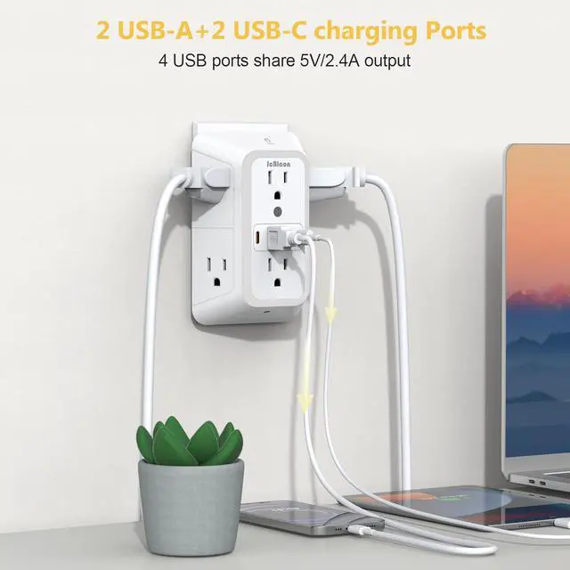 Wall Plugs with USB PortsThe extra plug wall outlet features 2 USB-A ports and 2 USB-C port. Each USB port features 5V/ 2.4A Max output. Built-in smart technology, detecting charging devices and delivering optimal charging speed automatically, compatible with most USB devices.