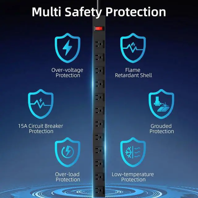 OVERLOAD PROTECTION: A power switch with lighting has a built-in high quality 15A circuit breaker for overload protection. When the operating current exceeds the rated current, this power strip automatically cuts off the power supply from spikes, fires or other unsafe conditions.