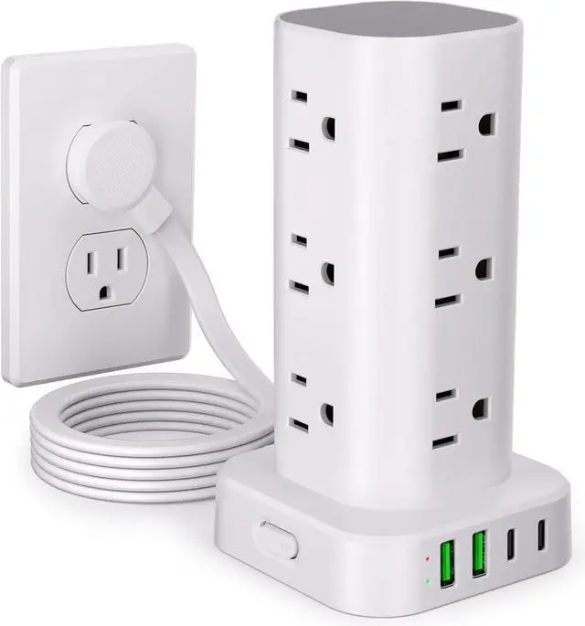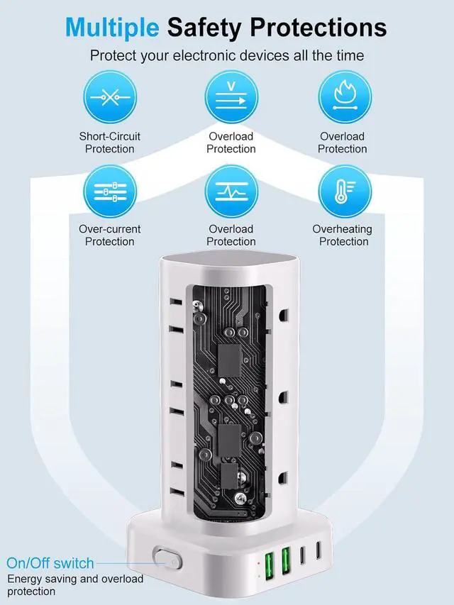 Surge Protection & Overload Protection: This power strip tower features an 1800J surge protector with overload, short-circuit, and over-current protection. The reset/off switch helps you save energy on the go. In case of overload, it shuts off automatically to keep your precious devices safe. Safeguard your gadgets and enjoy a reliable charging environment