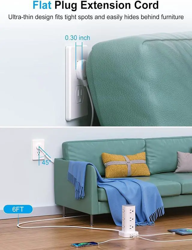 Ultra-thin Plug & 6FT Extension Cord Power Strip Tower: This 0.3 -inch sleek flat-head plug design provides a flush wall fit, perfect for tight spaces behind sofas, nightstands, bookshelves, and headboards. Its 45° angled outlets prevent blockage. The 6FT extension cord offers versatility for use in homes, offices, dorms, or as college supplies