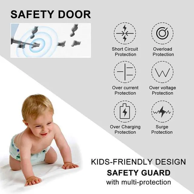 Childproof Design: Creative protection cover design safety door which is designed for protection of young children. This can effectively prevent children from electric shock which can occur if children are able to insert their fingers into the plug sockets.