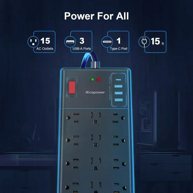 19-in-1 black extra long power strip - 15 ft power strip With 15 AC outlets and 4 USB ports1 USB C Port, this USB power strip can charge up to 19 devices simultaneously with no more than 1875W/15A. The built-in smart IC chip automatically adjusts and provides optimal charging speed for your electronic devices with USB power output up to 2.4A /port, USB C port MAX 5V/3A, 20W total.
