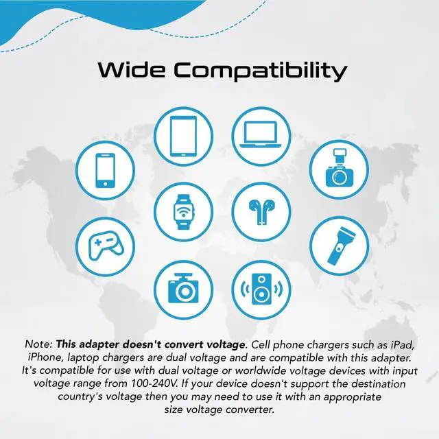 THE WHOLE WORLD COVERED - AE (Type C) UK (Type G), US (Type B), AU (Type I), EU (Type E/F), JP (Type A) Plugs compatible with outlets in North America, United Kingdom, most of Europe, Australia, Japan, parts of Africa, Middle East, Asia, China, and more