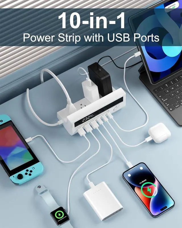 All Your Gadgets: Say goodbye to charging clutter with our versatile 10-port charging hub, complete with four AC outlets, three USB-C ports, and three USB-A ports. Perfect for powering up your phones, tablets, laptops, and even gaming consoles all at once
