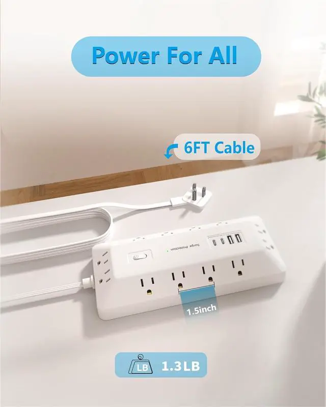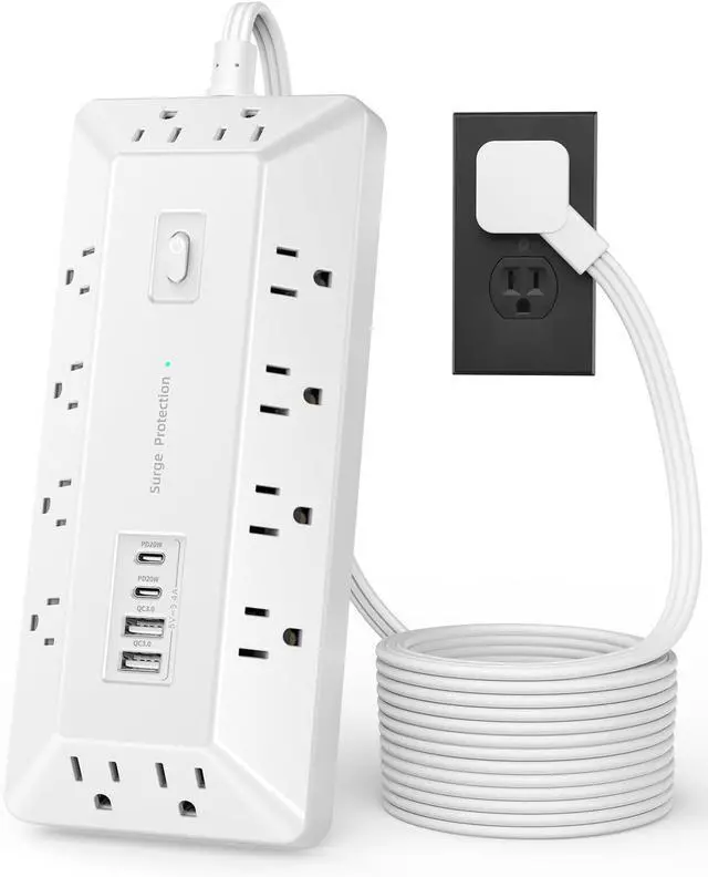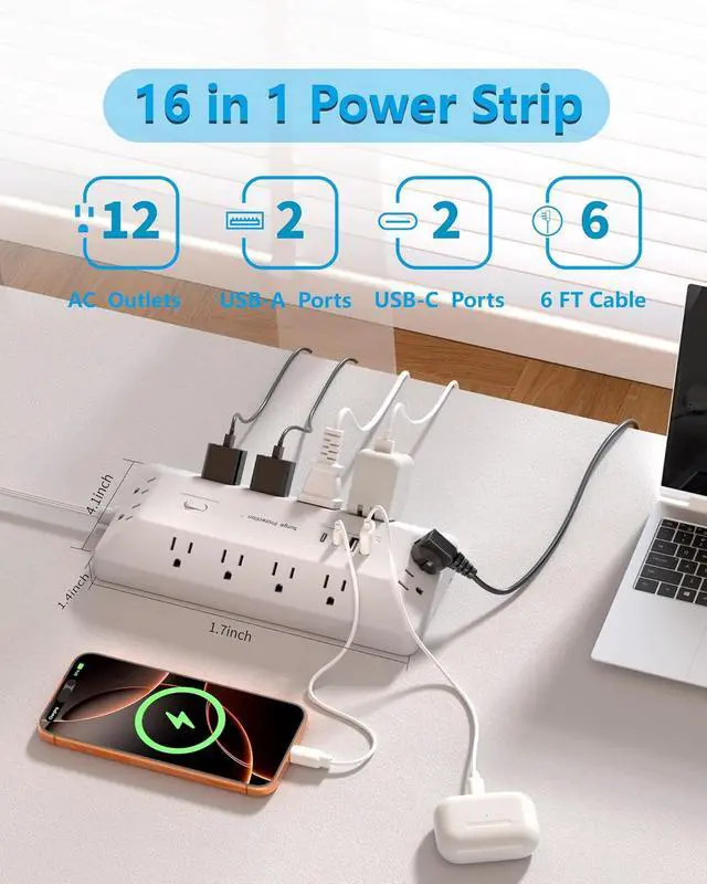 Power Strip: This multi plug power strip features 12 AC outlets and 4 USB ports to charge up to 16 devices. With a 6FT extension cord, 1625W/13A capacity, and 1800-Joule surge protection, it safeguards equipment from spikes and fluctuations