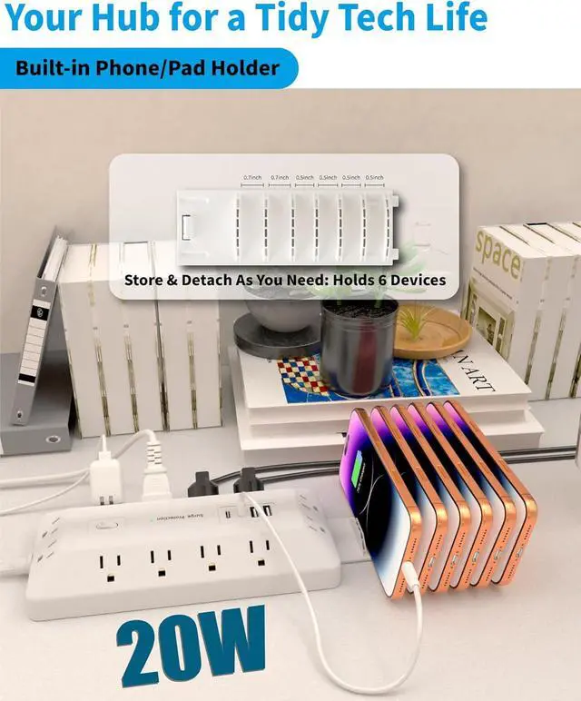 Keep Your Desktop Tidy: This surgery protector power strip features an detachable storage holder, allowing you to create the perfect slot for your phone or tablet while it charges. This prevents devices from sliding off desks and eliminates cable clutter, keeping your space organized
