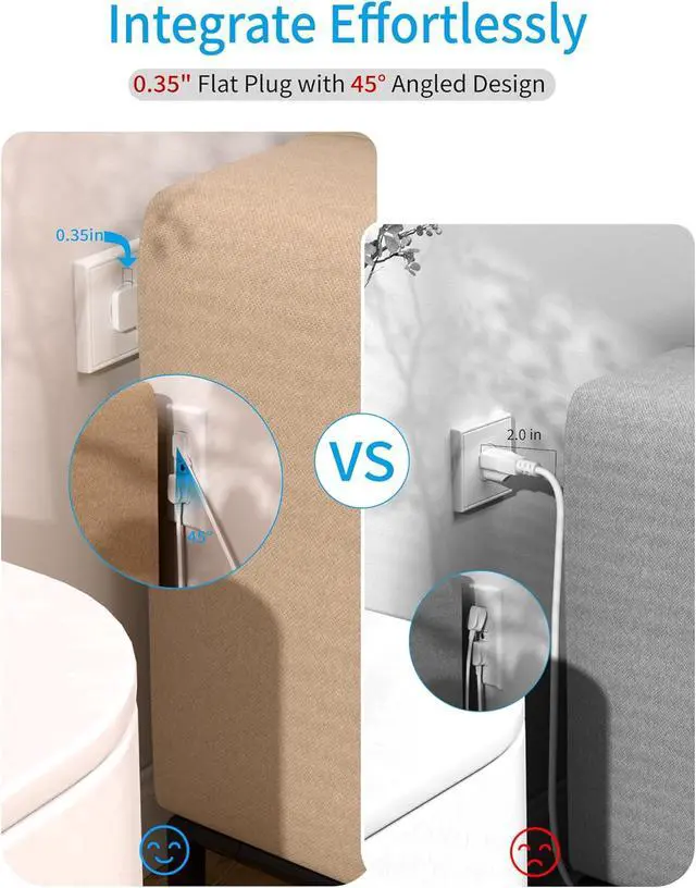 Space-Saving Design: This surge protector outlet has an ultra-slim flat plug ( 0.35 thick) and a 45-degree right-angle design to prevent obstruction of neighboring outlets. Its 1.5 -wide outlets fit bulky adapters, and the 1.1 standard spacing maximizes efficiency