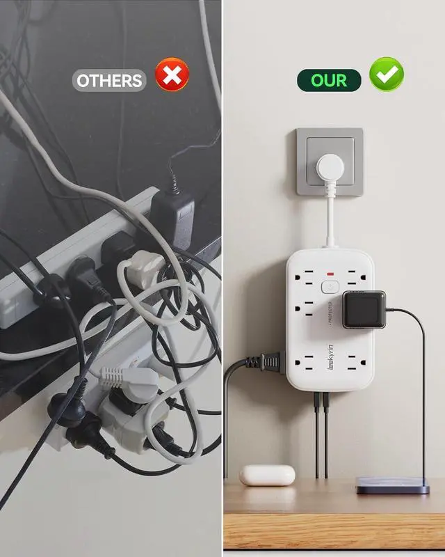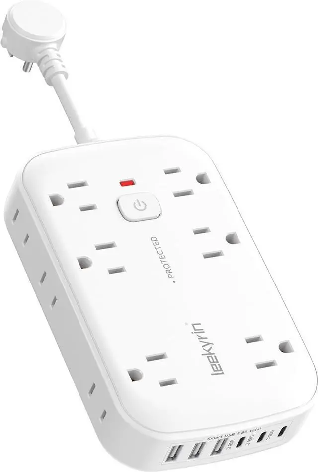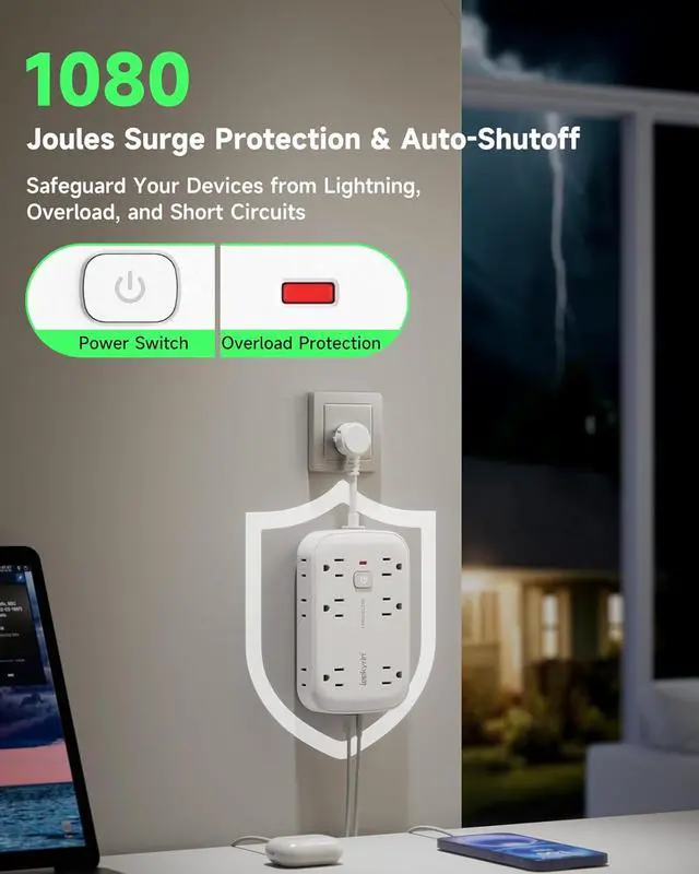 1080 Joules Surge ProtectionKeep your devices safe from unexpected power surges, lightning strikes, and voltage spikes with this surge protector. Featuring 1080 joules of energy absorption, auto-shutoff technology, and UL-certified fire-resistant PC material. The built-in overload protection instantly cuts power if the load exceeds 1875W (15A), while the grounded outlets prevent short circuits.