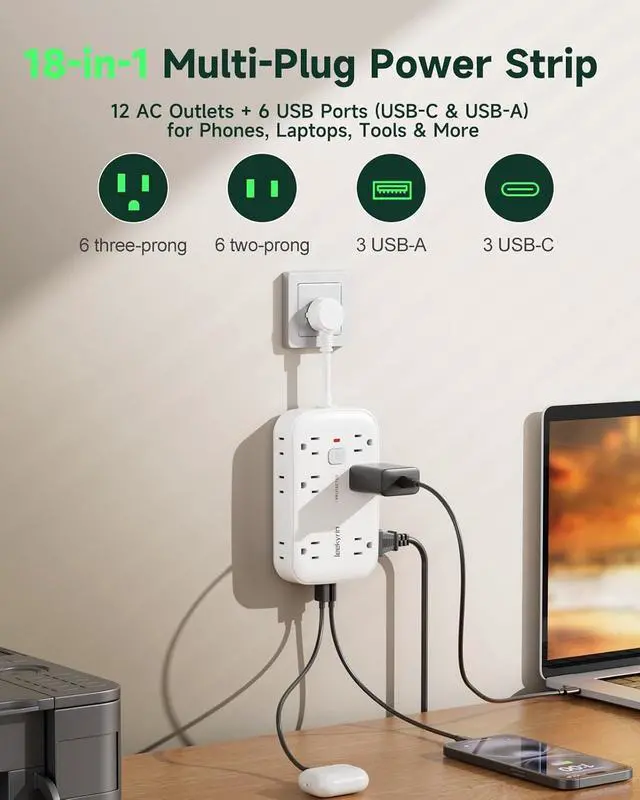 18-in-1 Power Strip with USB PortsThis power strip offers 12 AC outlets (6 two-prong + 6 three-prong) and 6 USB ports (3 USB-C + 3 USB-A), letting you charge up to 18 devices simultaneously.. The 24W USB output ensures fast charging, with USB-C ports delivering up to 15W (5V/3A) and USB-A ports up to 12W (5V/ 2.4A ).