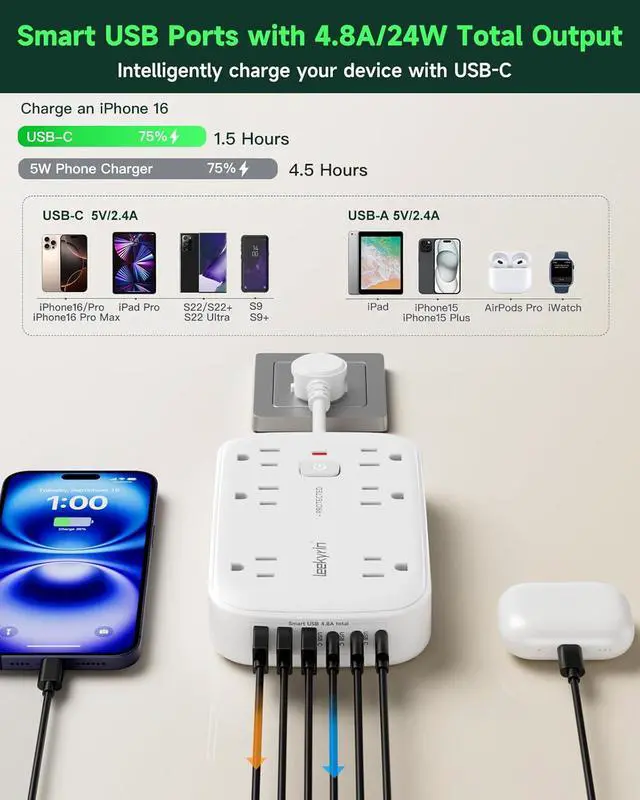 Smart USB Charging StationEquipped with 6 USB ports (24W total output), this USB power strip delivers fast charging for phones, tablets, and cameras. USB-C ports support up to 5V/3A (15W), while USB-A ports offer 5V/ 2.4A (12W). Smart IC technology auto-detects device needs to optimize charging speed without overheating. The LED indicator lights show real-time charging status.