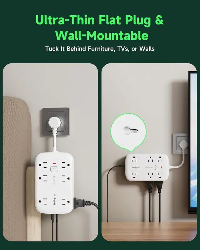 2-Inch Short Extension Cord & Ultra-Thin Flat PlugThis compact power strip features a 2-inch ultra-short cord and a 0.4 -inch flat plug that slides seamlessly behind furniture, TVs, or bookshelves. The slim profile ensures it never blocks adjacent outlets, while the lightweight design (11 oz) makes it easy to mount on walls or tuck into travel bags. Two built-in mounting holes let you secure it vertically or horizontally in kitchens, workshops, or bathrooms.