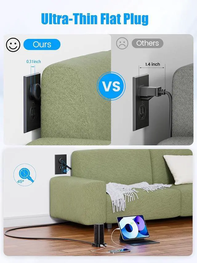Flat Plug Extension CordFeaturing a 0.31 in ultra-thin flat head, this flat plug power strip seamlessly fits into narrow spaces and can be discreetly tucked behind sofas, beds, or nightstands, sitting flush against the wall. The 45° angled design also allows for additional plug space underneath without obstruction.