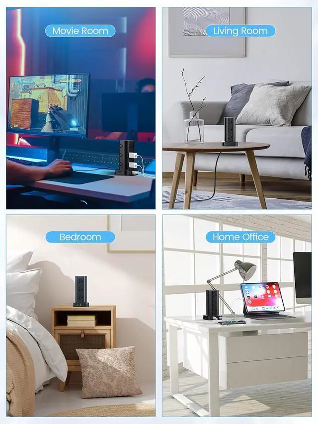 Compact and Organized Space SolutionThe all-in-one multifunctional charging tower occupies minimal vertical space, helping to keep your home or office organized and clutter-free. With 4 rubber feet at the bottom, it efficiently keeps the 6 ft extension cord from slipping and sliding.
