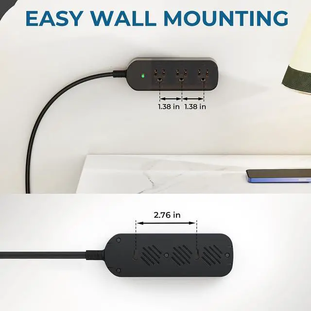 Multi-Function Power Strips: 45-degree flat plug design saves space against the wall, and the cable swivels 360° for durability. 2 keyholes on the back allow you to securely install this surge protector extension cord in various applications, such as workbenches, floor mounts, wall mounts, under counters, dorm room, garage, and more