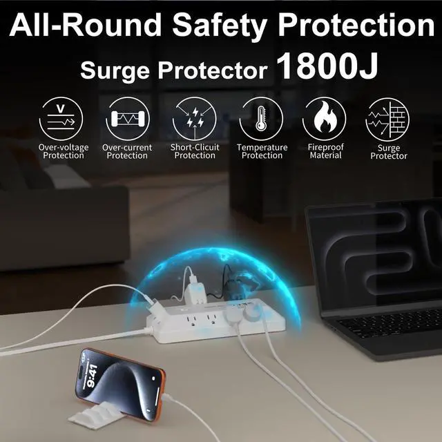 All-Around Safety: This power strip with surge protector (1800 Joule) plus short-circuit protection, over-voltage protection, over-current protection and high temperature protection, prevent damage to expensive appliances caused by voltage fluctuations