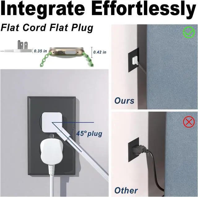 Flat Plug & Flat Cable: This multi plug outlet features a 6 ft flat extension cord and a 45°degree angled flat plug (only 0.35 inches) design. It easily navigates tight spaces - behind desks, under sofas or beds - without pushing furniture away from the wall