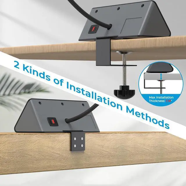 Two Kinds of Installation WayComes with install screws and mount clamp. Great charging solution for many occasions. This flat plug power strip perfectly fits well with your nightstand/writing table/computer desk or side table.