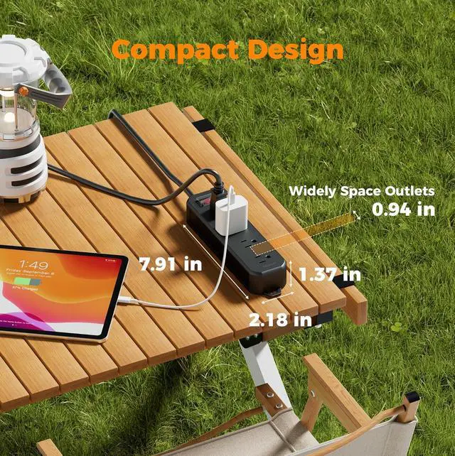 Mountable Wall Outlet Extender: The outdoor power strip is 7.9 × 2.18 × 1.37 inches, power strip surge protector features 1 wall mount holes for easy space management; 4 rubber feet keep it securely in place, preventing slips and slides