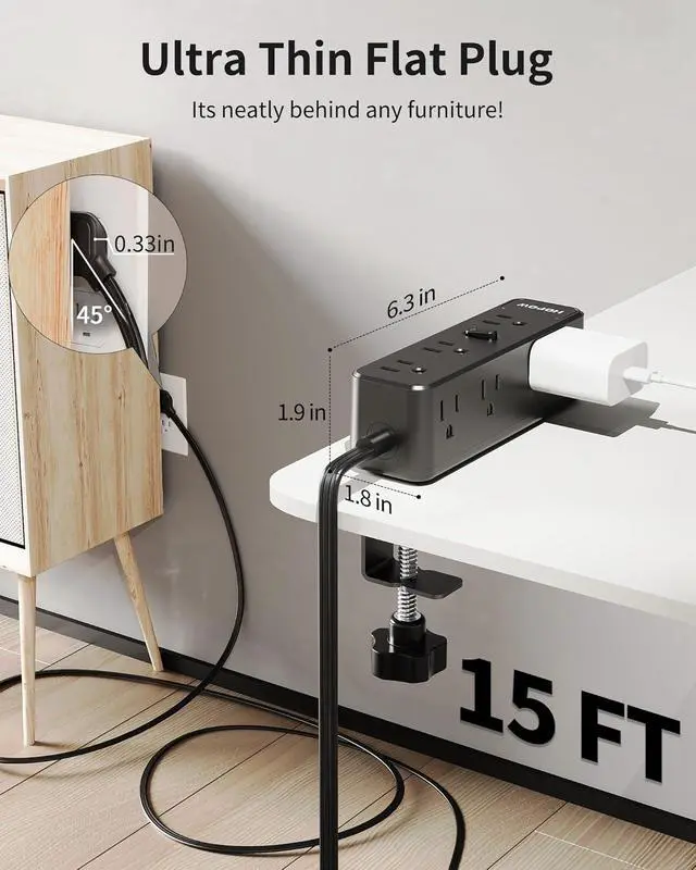 Ultra Thin Flat Plug & 15Ft Extension Cord: With only a 0.33 -inch very slimmer ultra-thin plug, it' s easier to access any wall socket and hide in the back of the sofa. A 45° right-angle design will not block the bottom receptacle of your duplex wall outlet. The 15-foot power strip is 50% thinner than the traditional power cords to run it under a rug or along walls.