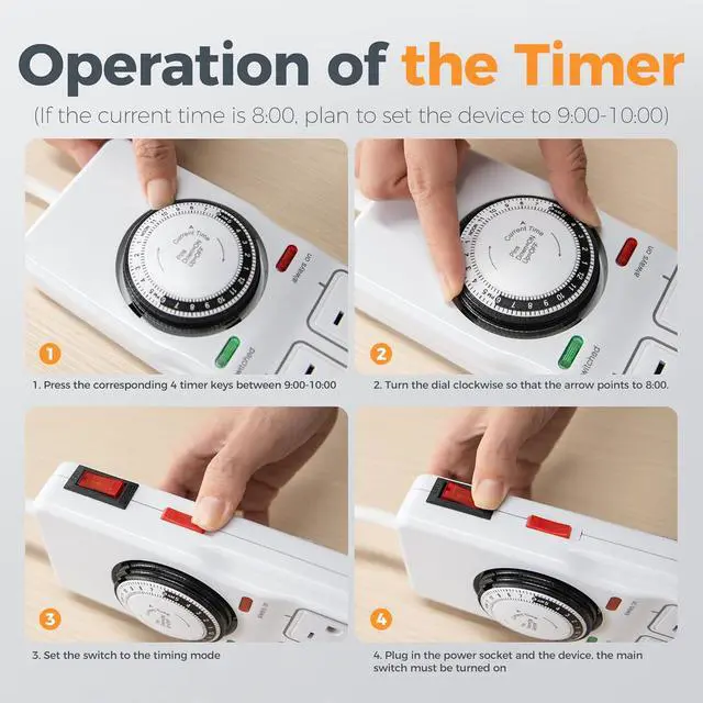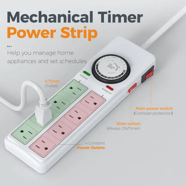 Mechanical Timer Power Strip: The timer outlet can plan daily, equipped with 4 AC outlets for timing, 4 AC outlets are always powered, and can connect 8 devices simultaneously; The timer pin dial can be set in increments as low as 15 min