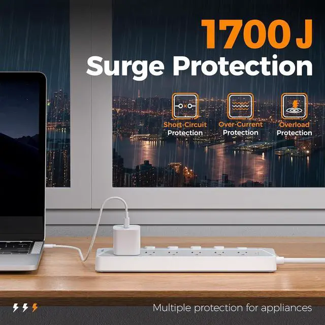 1700J Surge Protector Outlet: Featuring a power strip with surge protection, overload protection, short circuit protection, it offers a comprehensive safeguard for electronics; The main switch shuts off automatically during overloads to protect devices