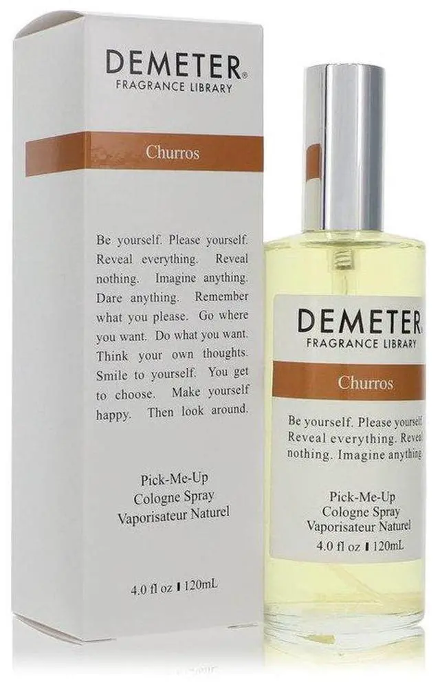 : br Churros are a beloved Mexican food, and the new aroma by Demeter allows you to carry the tantalizingly delicious scent of your favorite food everywhere you go. Demeter Churros is a gourmand fragrance that blends the irresistible scent of tender, flaky dough with warm cinnamon and sugar for a tantalizing scent that is great for casual wear. Wear it to enjoy the scent of your favorite treat, but beware because it may start a craving for churros!
