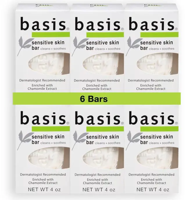 Basis Sensitive Skin Bar Soap - Cleans and Soothes with Chamomile and Aloe Vera, Use as Body Wash or Hand Soap - Pack of 6