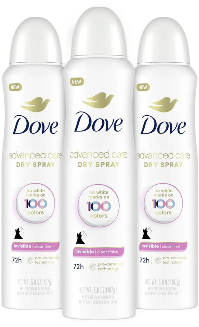 With Dove Invisible Dry Spray Antiperspirant Deodorant, Clear finish 3.8 Oz you can step out in style wearing any color you like with confidence. This dry spray Antiperspirant is invisible on 100 different colors. It goes on instantly dry, and with up to 48 hours of long-lasting odor and wetness protection, you can do your thing, knowing that you will smell great all day. As well as being unbeatable on white marks and protecting you from sweat stains, Dove Invisible Dry Spray clear finish Provides excellent underarm care. Its 100% alcohol (ethanol) free formula is kind on your gentle underarm skin.