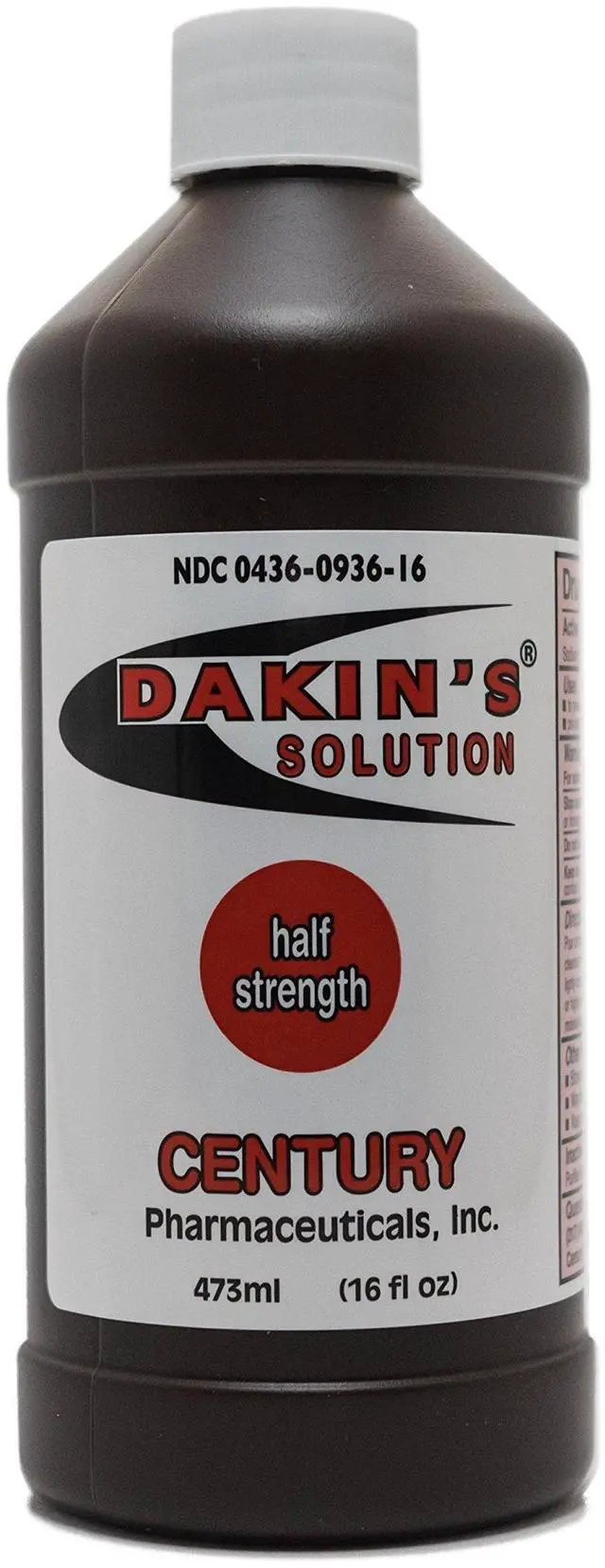 Product DescriptionSOLUTION DAKIN'S. 25% 16OZManufacturer Contact InformationDakin's Solution-Half Strength Sodium Hypochlorite 0.25 %, Wound Therapy for Acute and Chronic Wounds by Century Pharmaceuticals, 16 FL. OZ