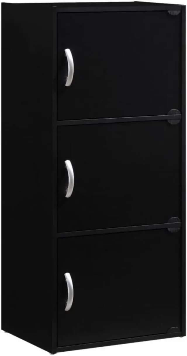pHID3 BLACK Hodedah 3-Shelf, 3-Door Bookcase in Black, Organize your home or office space with the Hodedah Multi-Purpose Bookcase. Its slim design makes it versatile for corners and limited spaces in multiple rooms. Perfect for organizing books, stationary, papers, folders and files in your office. You can place it in your child's bedroom to store toys, folded clothes, shoes and much more. You can keep it in the kitchen to store can goods, small appliances, pots and pans. Use this unit in the laundry room to store your detergent and other laundry supplies.