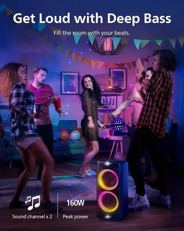 GET LOUD: With 2.0 sound channels, 160W maximum power and 80W RMS, this Bluetooth speaker fills the room with deep, thumping bass. Just what you need to get the party started.