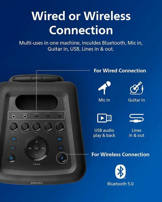 Philips X5206 bluetooth party speaker, portable with wheels, exciting light show, karaoke machine with microphone and Guitar Input, powerful bass & subwoofer, long playtime, perfect for outdoor events