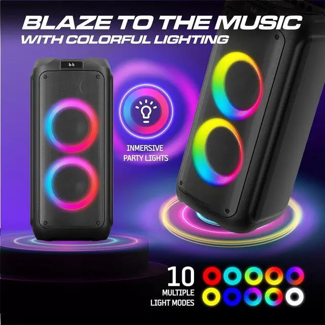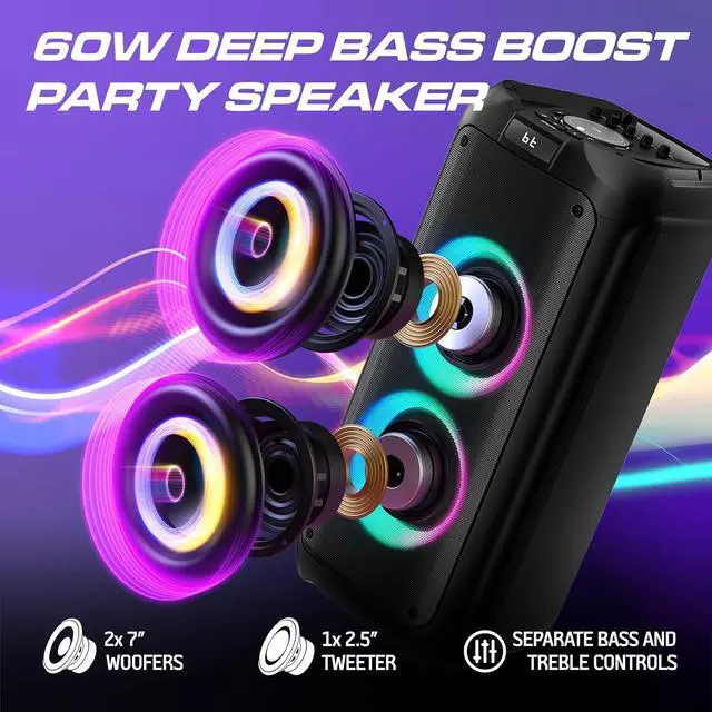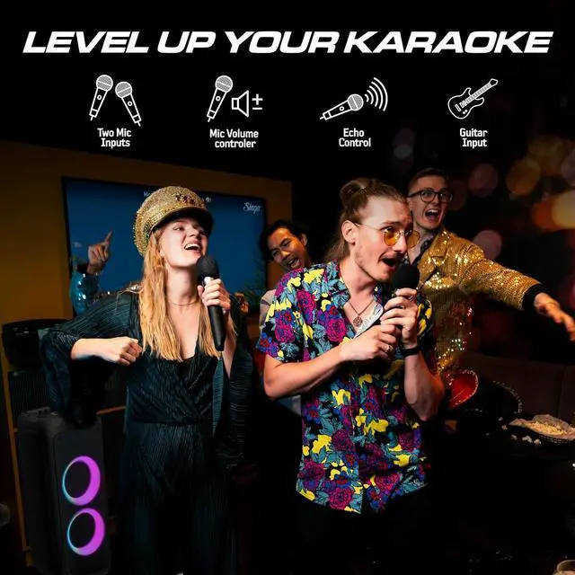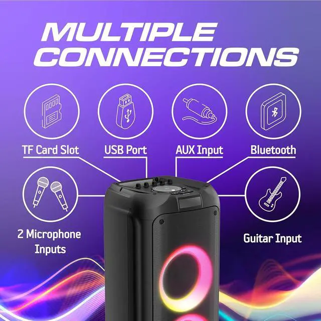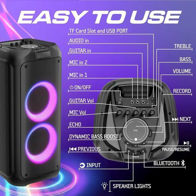 Bring the party anywhere with the Philips Bluetooth Party Speaker TAX4509. Designed for powerful sound and vibrant entertainment, this portable speaker delivers 120W max output power with Dynamic Bass Boost to keep the beats pumping. Create the perfect party atmosphere with 10 RGB light effects, and take center stage with karaoke-ready microphone and guitar inputs. Whether you stream via Bluetooth 5.0, plug in through USB, TF card, or AUX, or switch to FM radio, your music options are limitless. With up to 16 hours of playtime, easy transport handle, and True Wireless Stereo pairing, this speaker is built for both indoor and outdoor celebrations.