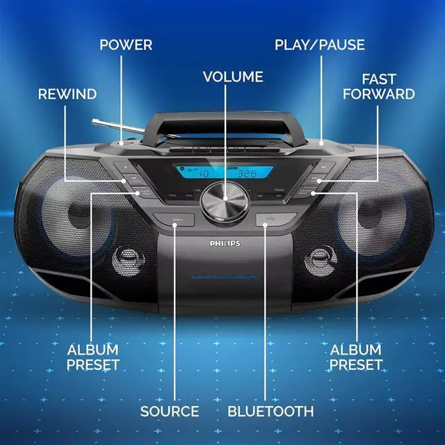 EASY TO USE: The simplistic, stylish design of this CD Player Boombox fits right in with your trendy home. With large control buttons and backlit LCD display, this easy-to-use compact CD player is a perfect choice of cd players for home, in the shop, or on the go.