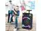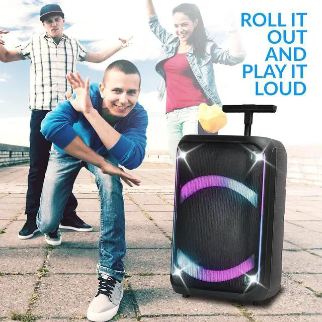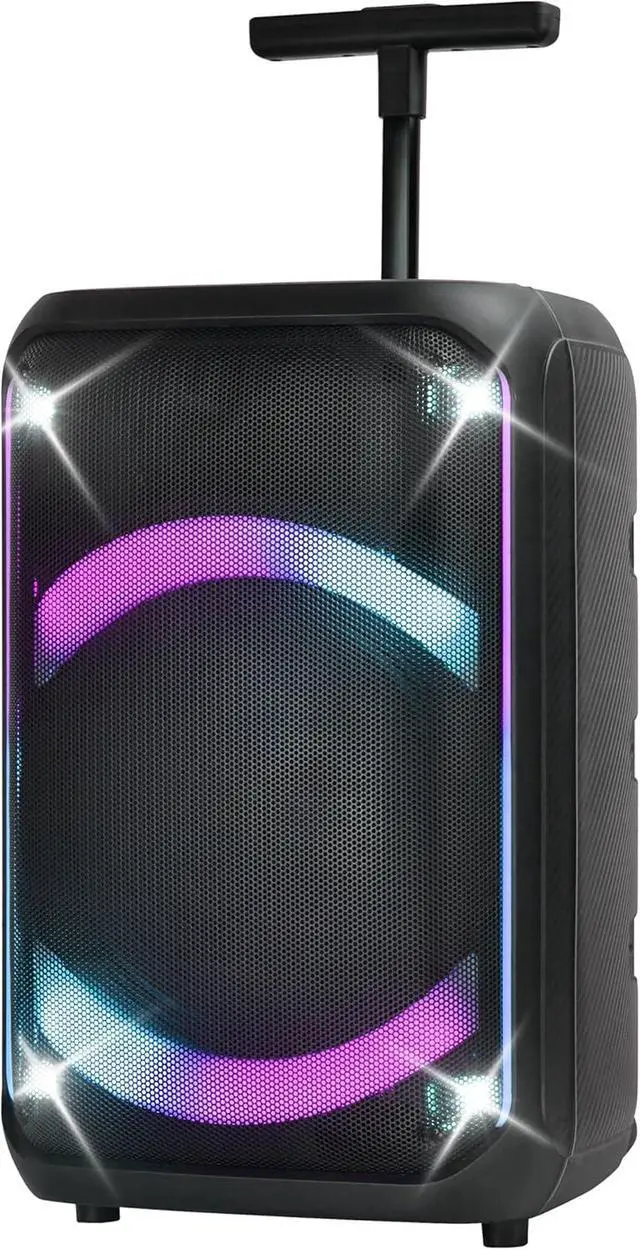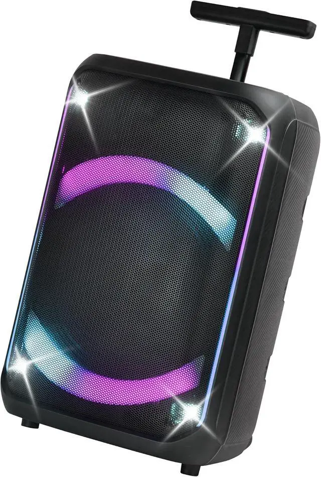 - : Designed for easy transport, the speaker comes with a trolley, handle, and wheels for effortless mobility. Its rechargeable battery, with a capacity of 3,000mAh, provides up to 4 hours of playtime at 20% volume, while the durable construction ensures reliability in any setting.