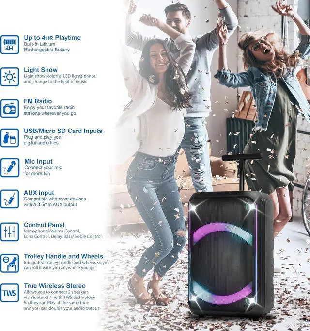 : Enhance your audio experience with a mesmerizing light show. The colorful LED lights pulsate and dance to the rhythm of your music, adding a vibrant visual element to your gatherings or performances.