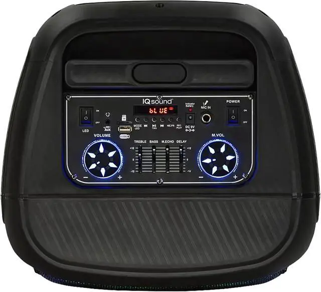 : Equipped with USB, Micro SD, and AUX inputs, this speaker accommodates non-Bluetooth external audio devices, ensuring compatibility with various sources. Take full command with the control panel featuring EQ levers for treble, bass, mid-echo, and delay adjustments.